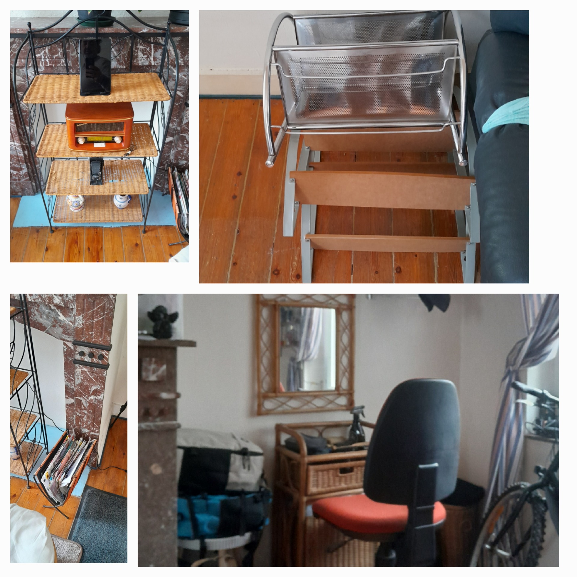 # A vendre materiel salon de coiffure debutant 1 pers ( outil ,accessoire, 3 petits meubles suspendus ). Miroir et coiffeuse rotin , panier rotin et etagere decorative .